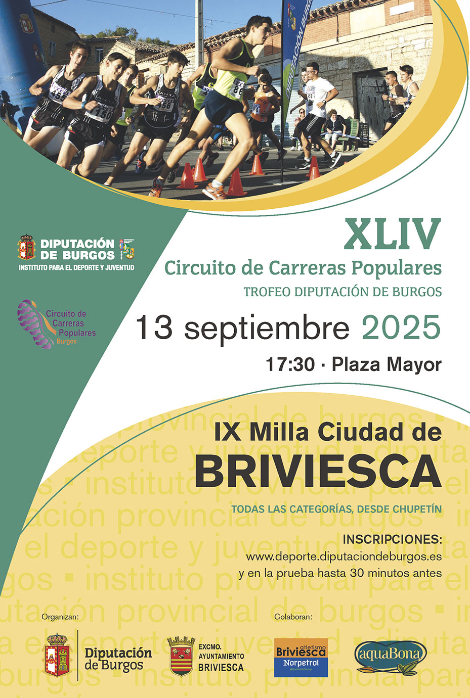 La inscripción es gratuita y está abierta a todos los corredores interesados (on-line https://deportes.diputaciondeburgos.es/competicross.php hasta el jueves 11 de septiembre), que podrán participar en una carrera que combina el ambiente festivo de las calles briviescanas con el atractivo competitivo del circuito provincial, en el que se dan cita cada temporada centenares de atletas de toda la provincia.