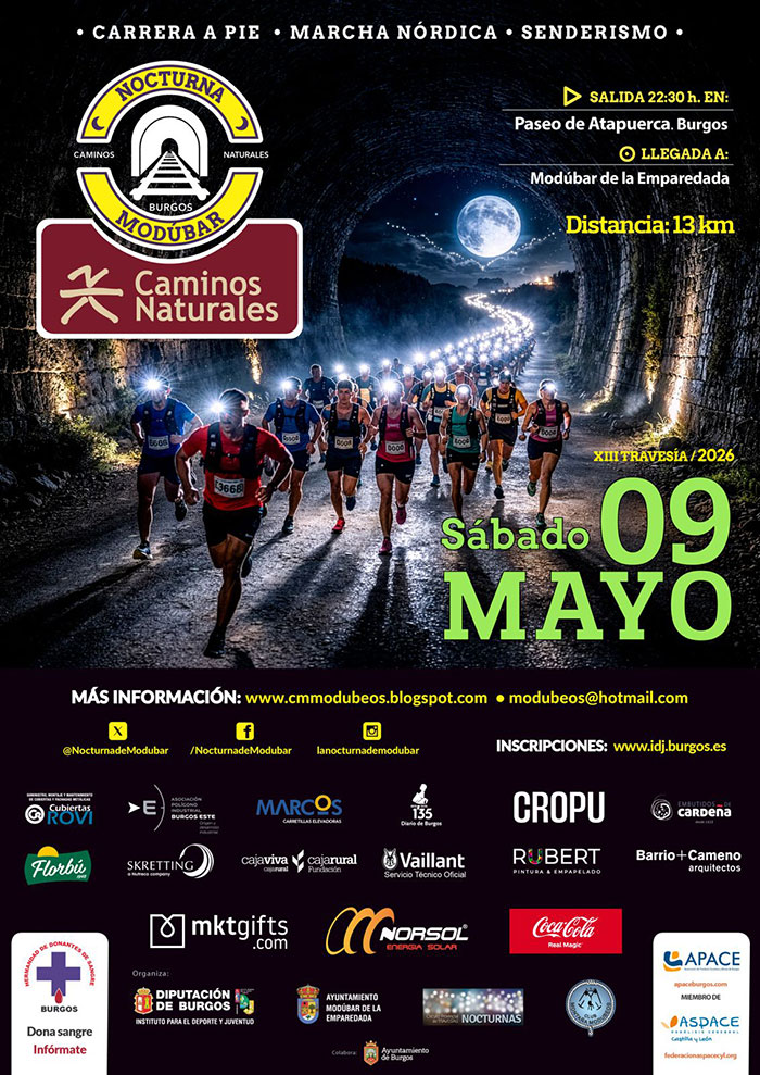 El Instituto Provincial para el Deporte y Juventud de la Diputación de Burgos pone en marcha el sábado, 9 de mayo, el XII Circuito Provincial de Travesías Nocturnas con la celebración de la XIII Nocturna de Modúbar – Caminos Naturales, una de las citas más multitudinarias del calendario deportivo provincial.